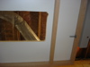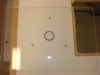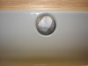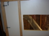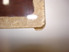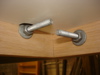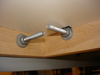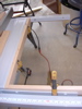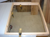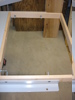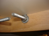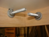 In Fig. 11 and 12, you can see the frame constructed and installed with all 6 bolts. Lookin' good so far. Fig. 13 reveals my next hurdle. Even with the skinny bolts and additional play of the larger holes, the nut still interferes with flushing the melanine into the frame. So, I marked the general area where the nuts meet the melanine with a marker (Fig. 15), turned the top over and routed a freehand hole where they meet. (Fig. 16)
